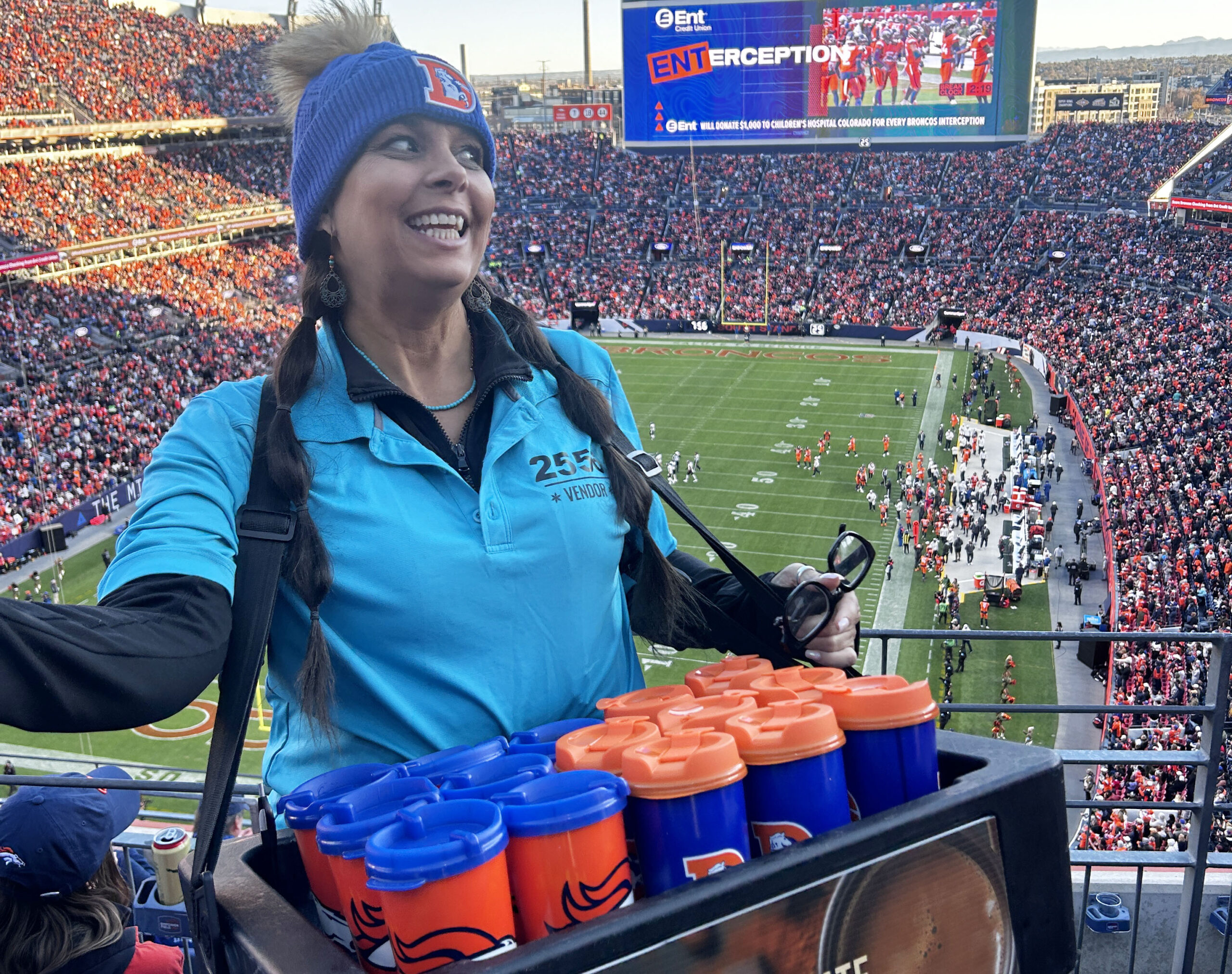 At Empower Field, Chillco Drinks has mobile hawkers near sections 130, 326, and 518 - or walking near any of those areas.